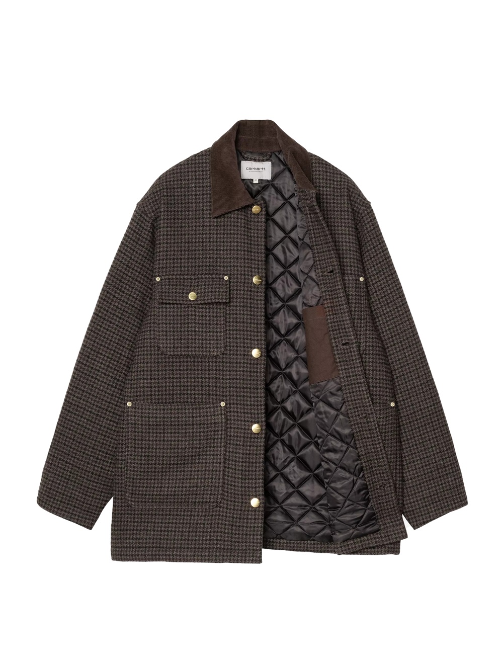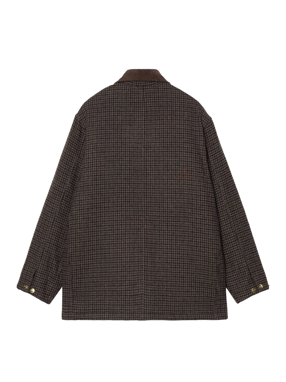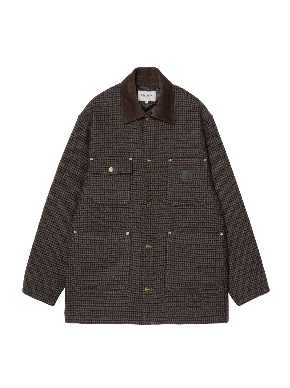 The Lowis Chore Coat is made from a heavy polyester-wool blend fabric and features an all-over houndstooth pattern.