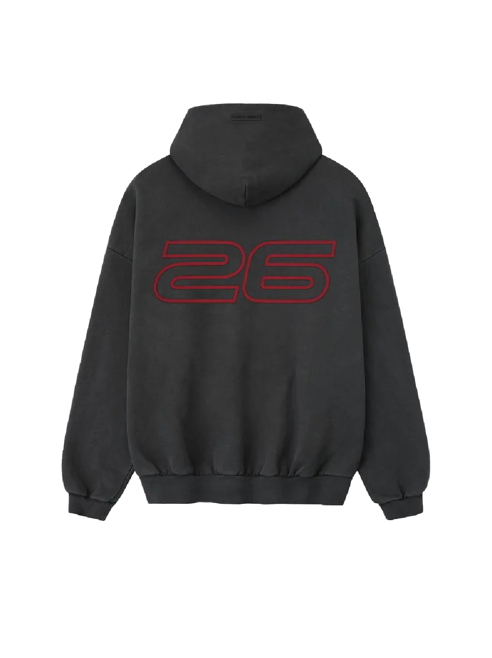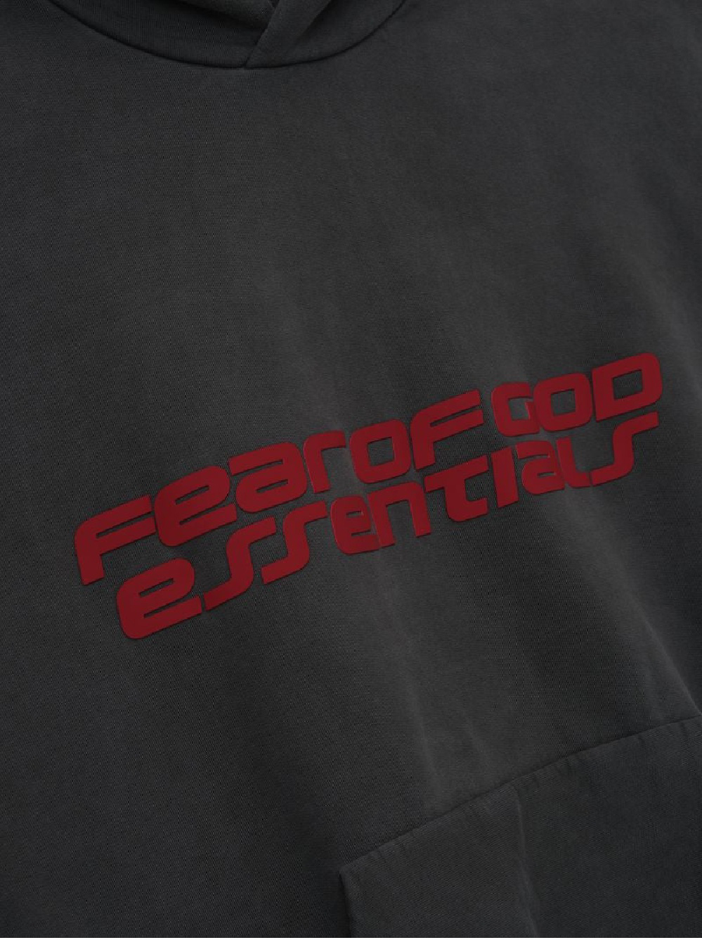 The Heavy Fleece Hoodie is crafted from 520gsm heavy fleece and treated with a pigment dye to create rich depth of color. Designed in an oversized 90s-inspired silhouette, it features exaggerated proportions with dropped shoulders for a relaxed drape. The hoodie is defined by HD-printed graphics—“Fear of God Essentials” logo on the front and “26” on the back. Finishing details include a kangaroo pocket, rib-knit cuffs, waist-hem and a Fear of God Essentials rubberized label stitched on the hood.