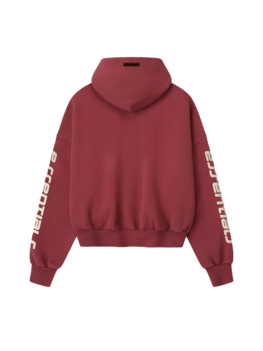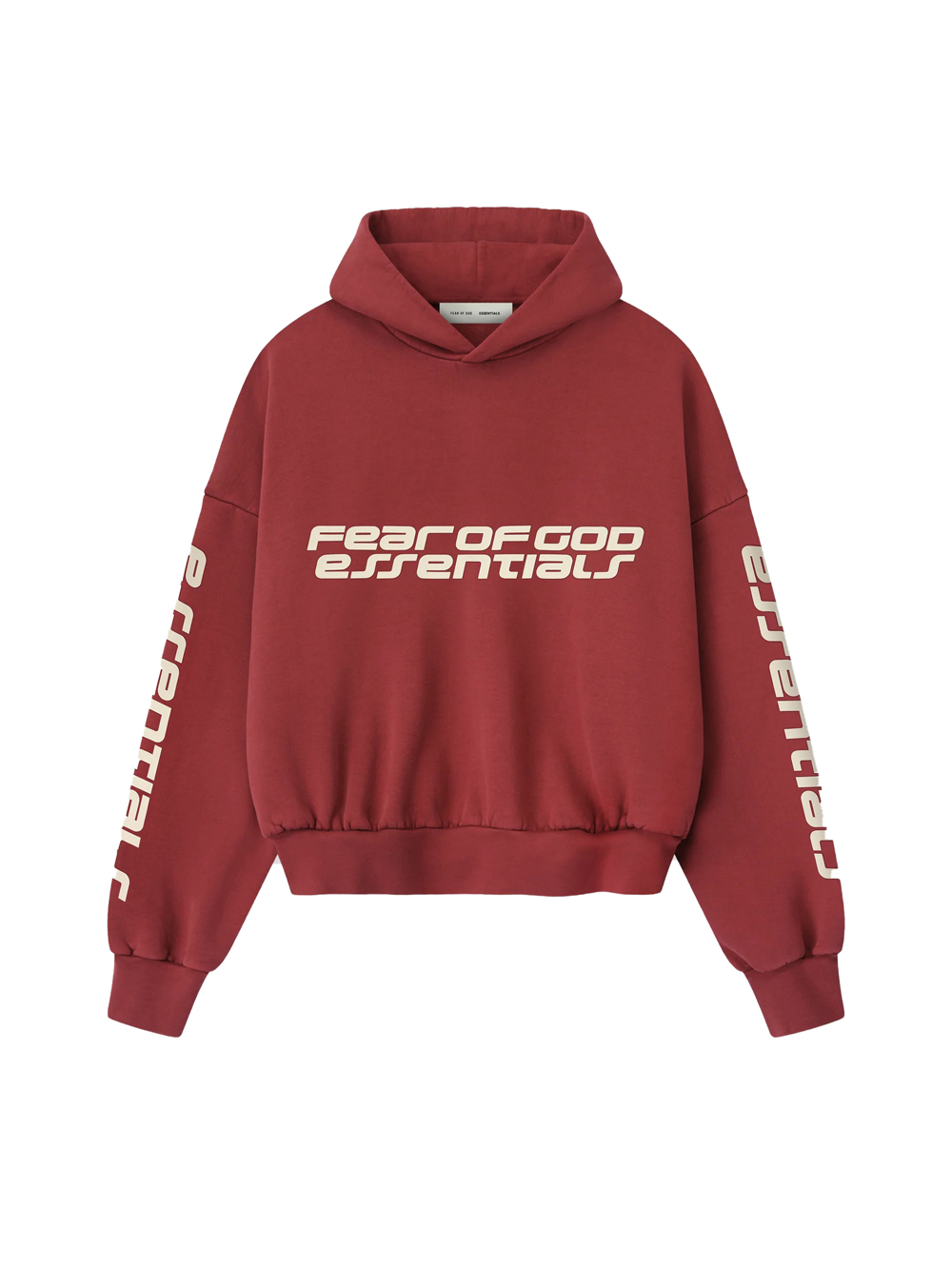 The Heavy Fleece Cropped Relaxed Sweatshirt is crafted from 520gsm heavy fleece and pigment-dyed to achieve a rich depth of color. Cut in a cropped, relaxed silhouette, it features exaggerated proportions with dropped shoulders for a laid-back drape. The design is defined by HD-printed graphics, including a “Fear of God Essentials” lockup across the front and “Essentials” along the arms. Finishing details include rib-knit trim at the cuffs, and waist hem, along with a Fear of God Essentials rubberized label stitched to the hood.