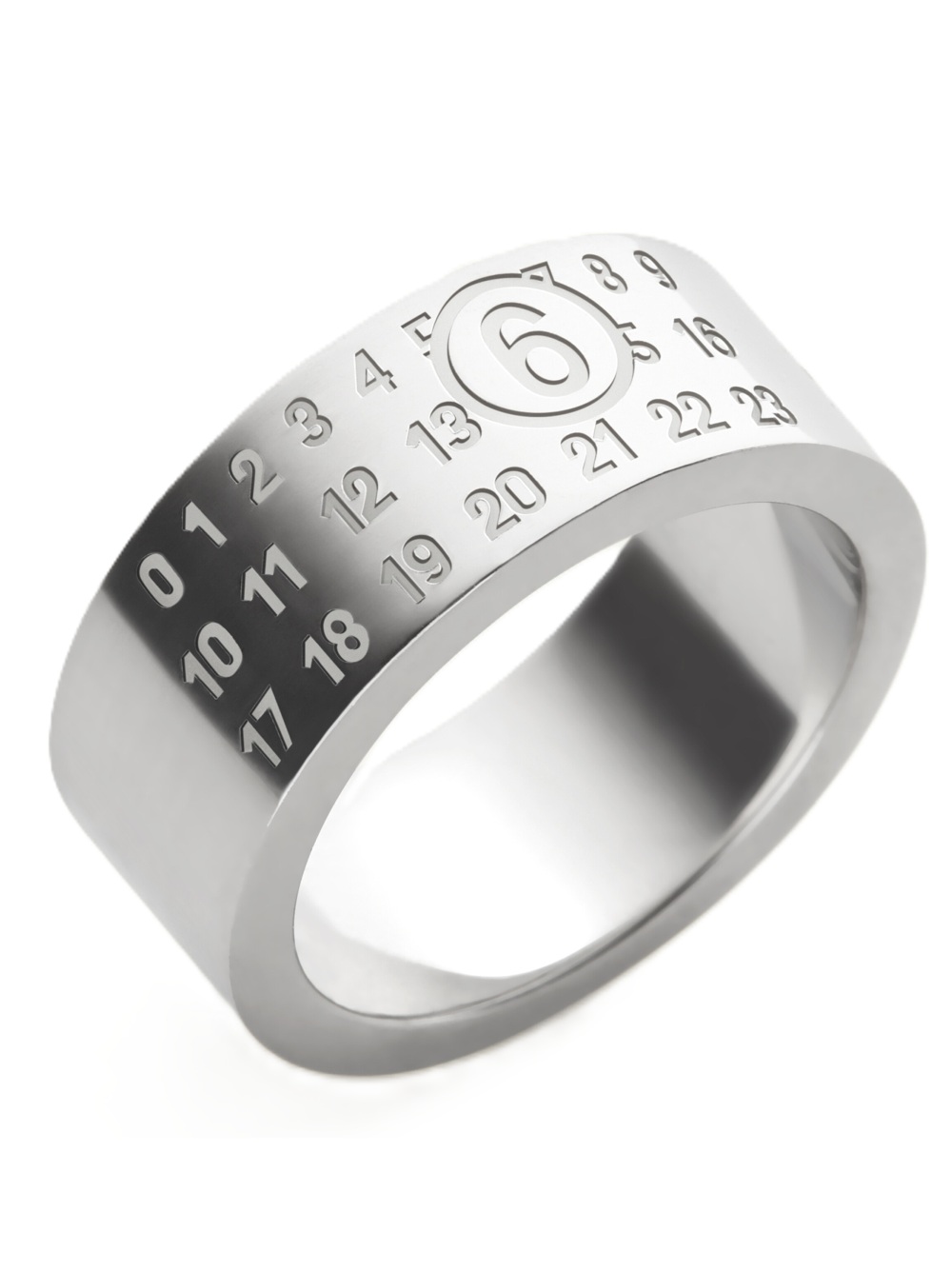 This cylindrical ring features a clean, round surface and a polished finish. Engraved with the MM6 numeric signature, it catches the eye while maintaining a understated presence.