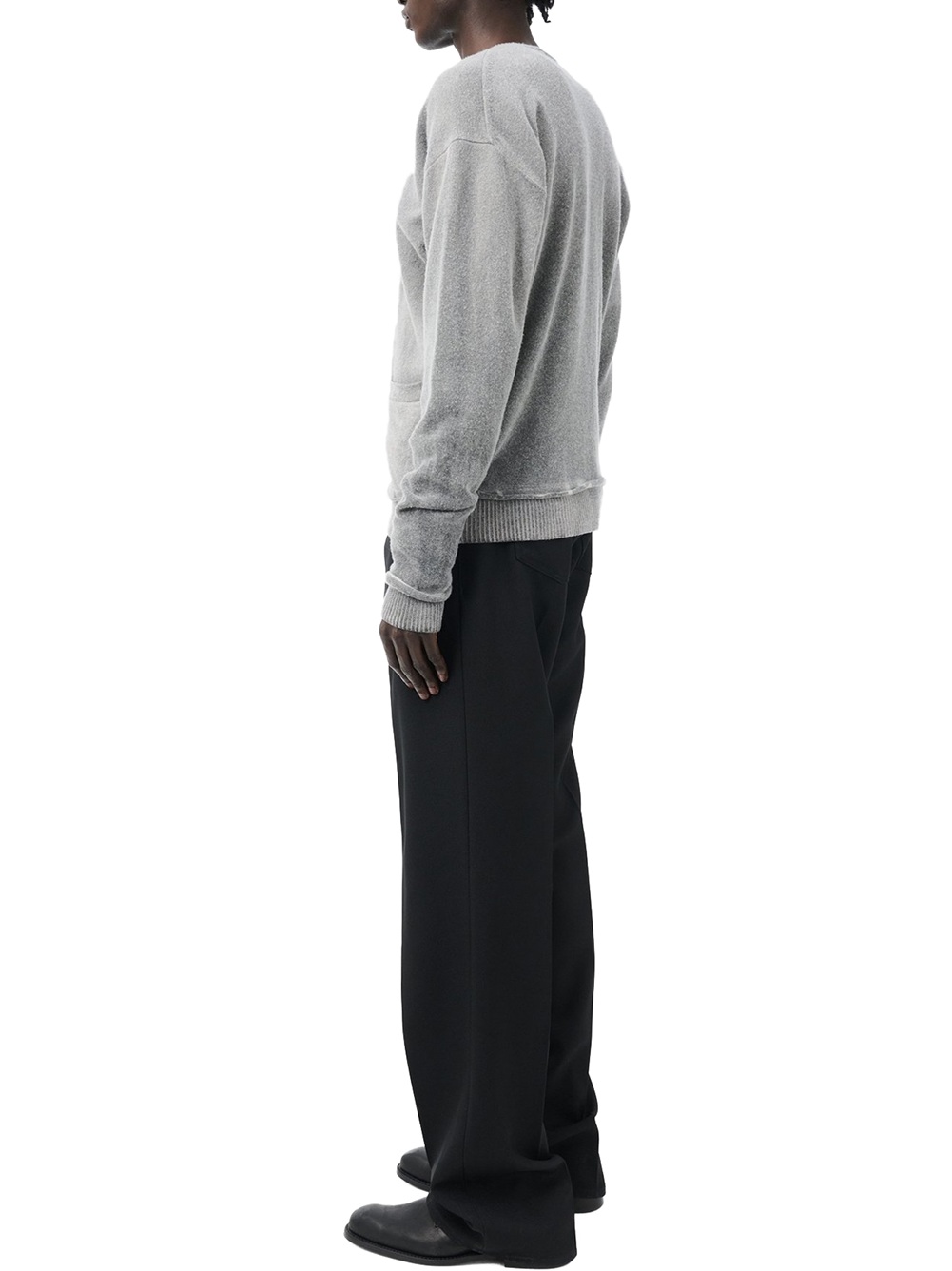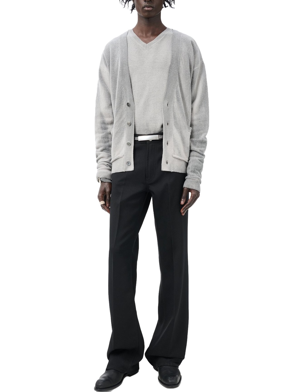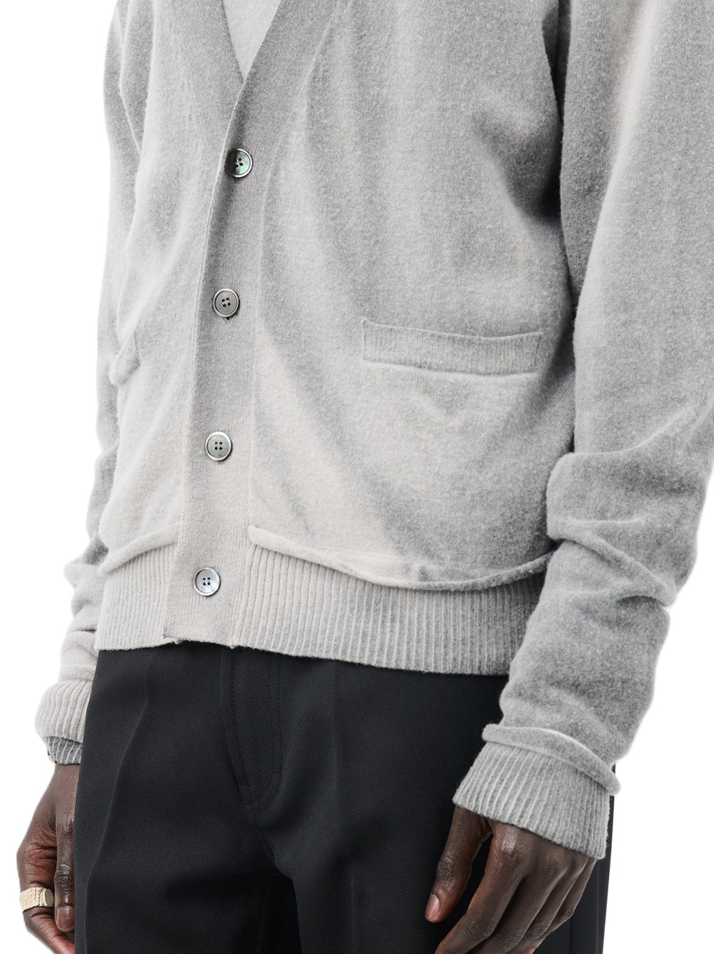 Parallel Cardigan in Grey Spray Dye Cherub Wool. Produced in refined Italian merino wool, has a relaxed fit with dropped shoulders and features a soft texture enhanced by custom cold spray dye treatment, a V-neck collar, pearl buttons, full needle placket, and two front pockets. The topstitched hems with rolling edges create a raw, slouchy aesthetic.