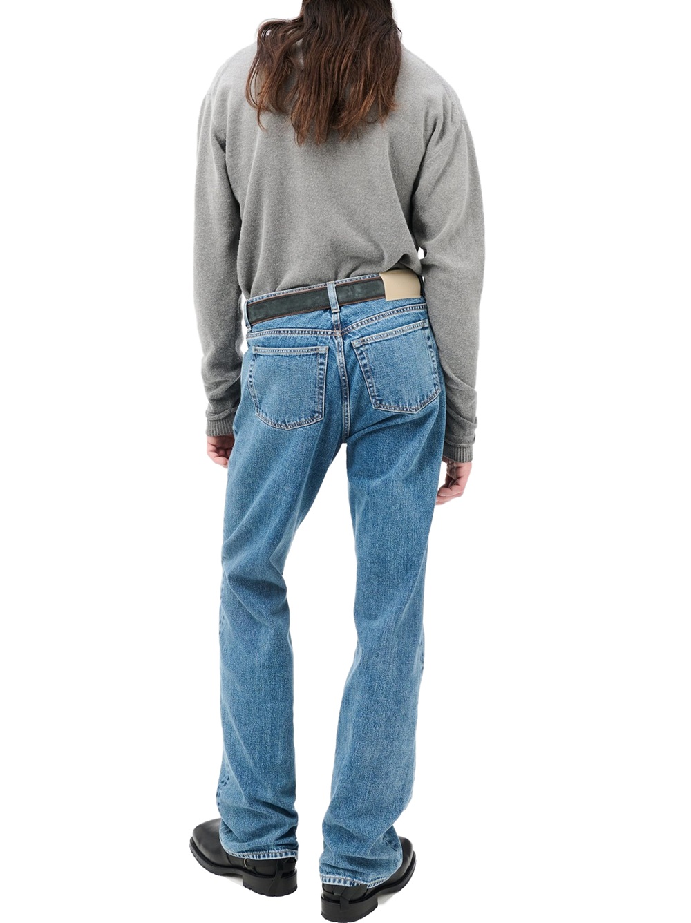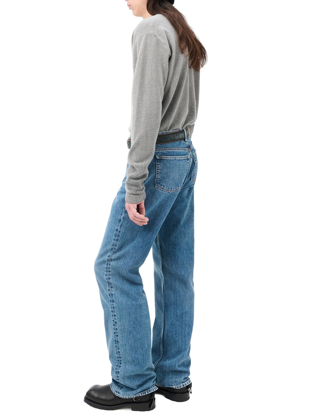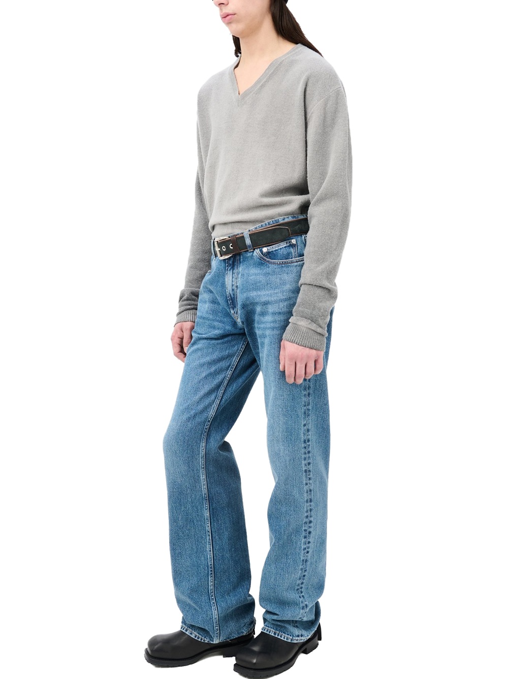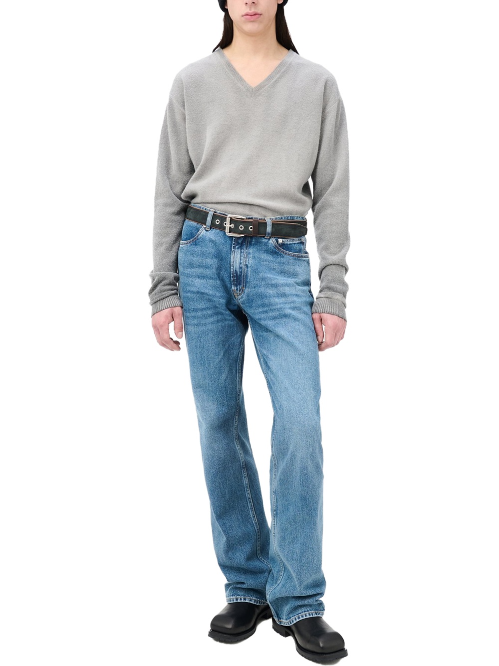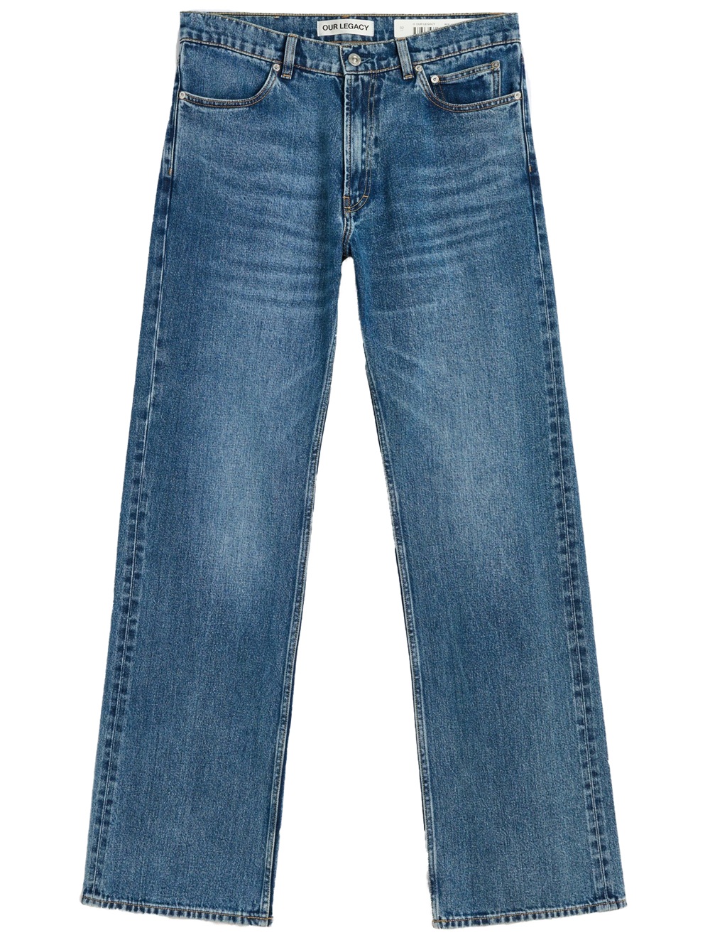 Carlson Cut in Rodeo Wash Broken Twill. Produced in Japanese cotton fabric with indigo dye, the men's Carlson Cut has a bootcut fit with a high waist, straight hip and slight boot cut flare, and features a zip fly, steel rivets, five pockets, and an Our Legacy embossed patch.