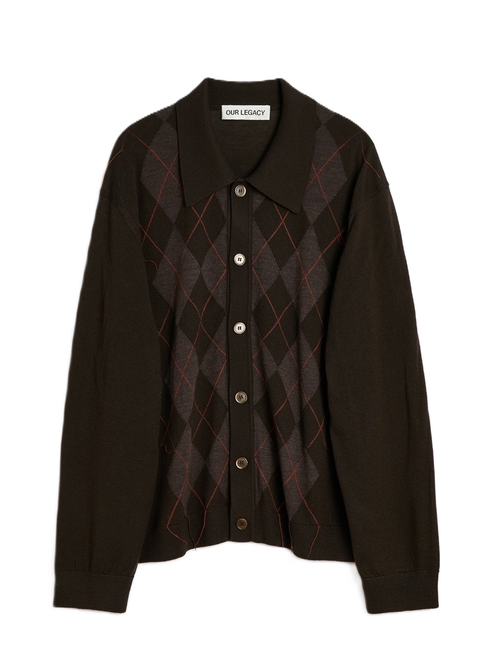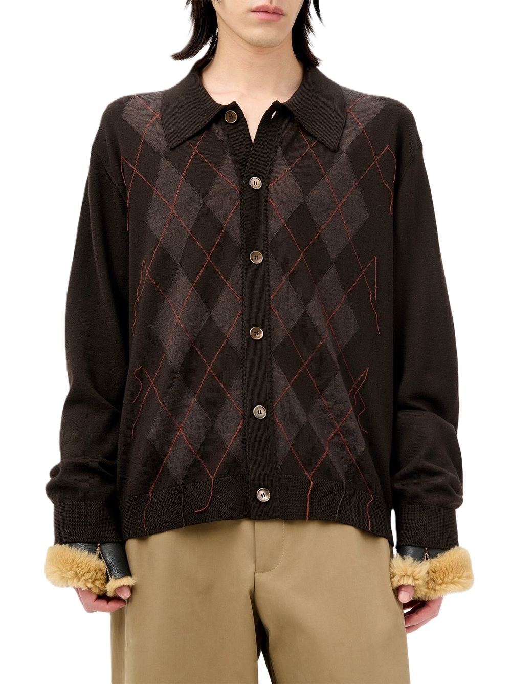 Pub Argyle fine wool evening polo shirt. Made from Italian wool yarn. It has a comfortable, boxy fit and features an exclusive tone-on-tone argyle pattern created with two different twisted wool yarns, diagonal lines with loose threads for a raw look. Pointed collar, mother-of-pearl buttons and deep ribbed straight hem.