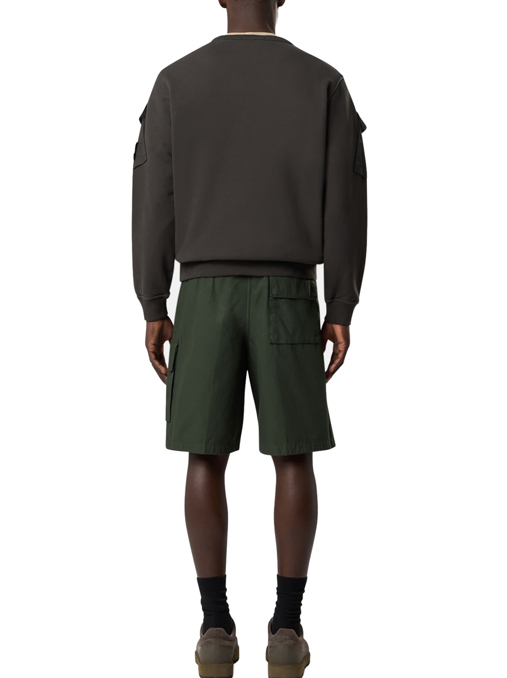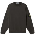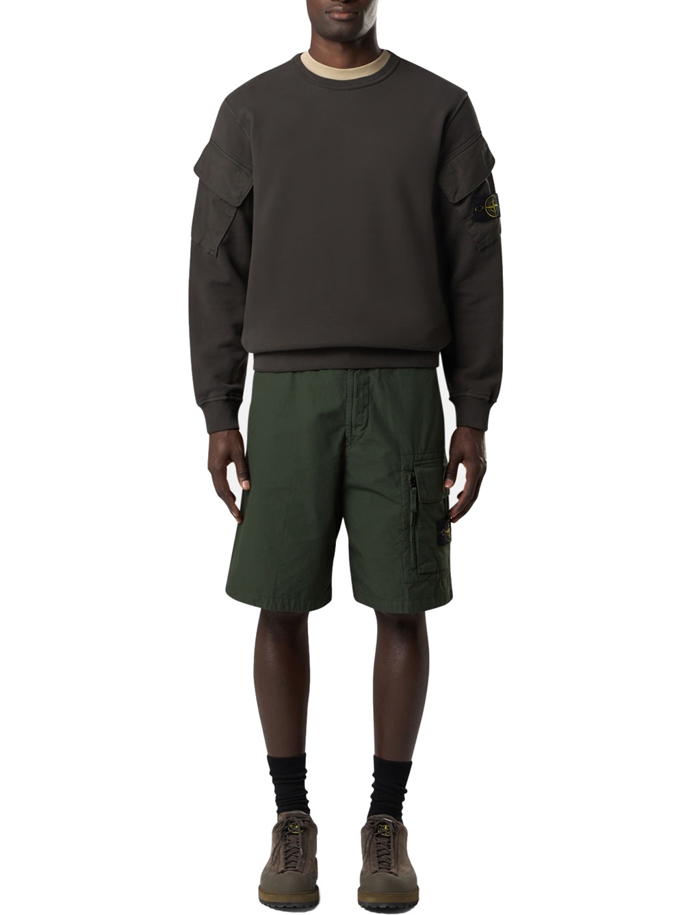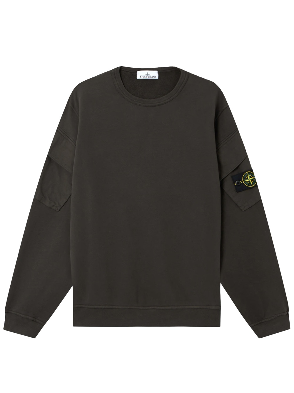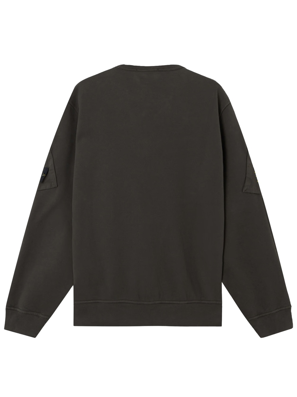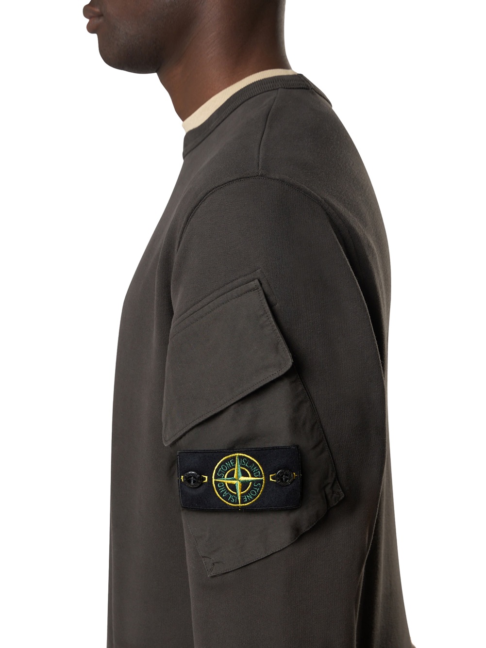 Gauzed organic cotton crew-neck sweatshirt. Garment-dyed model. Ribbed neckline. On the sleeves, bellows pocket in contrasting fabric with two snaps under the flap; Stone Island badge on the left sleeve pocket. Elasticated ribbed cuffs and bottom band. Regular fit.