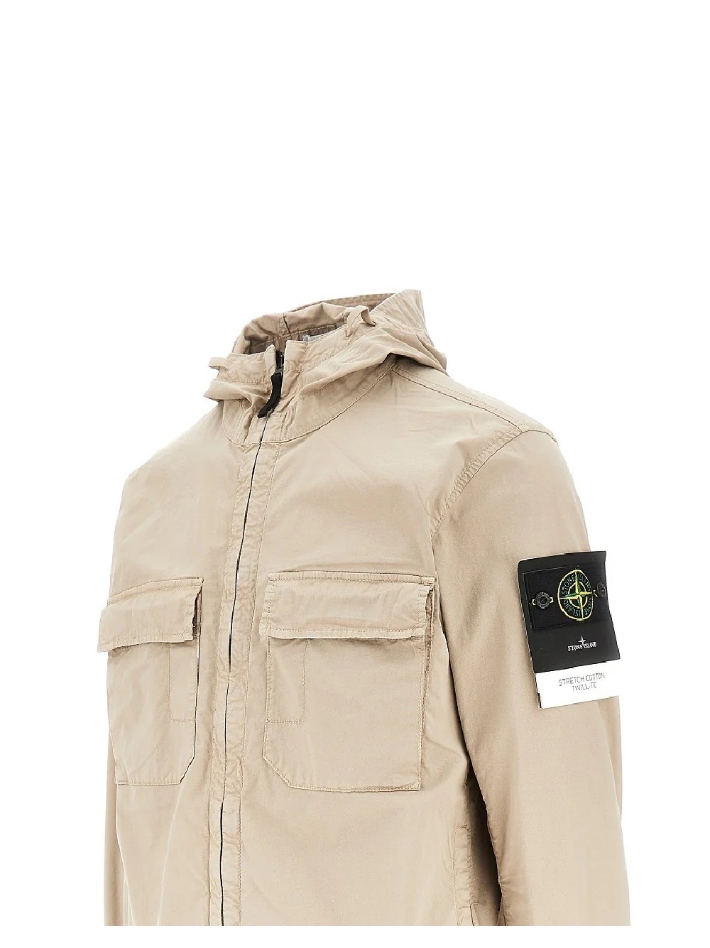 97% Cotone 3% Elastan Giacca con cappuccio in twill di cotone biologico stretch con tasche a doppio scomparto sul petto, tasche frontali, bordi elasticizzati e zip a scomparsa sul collo. Modello tinto in capo con antigoccia.