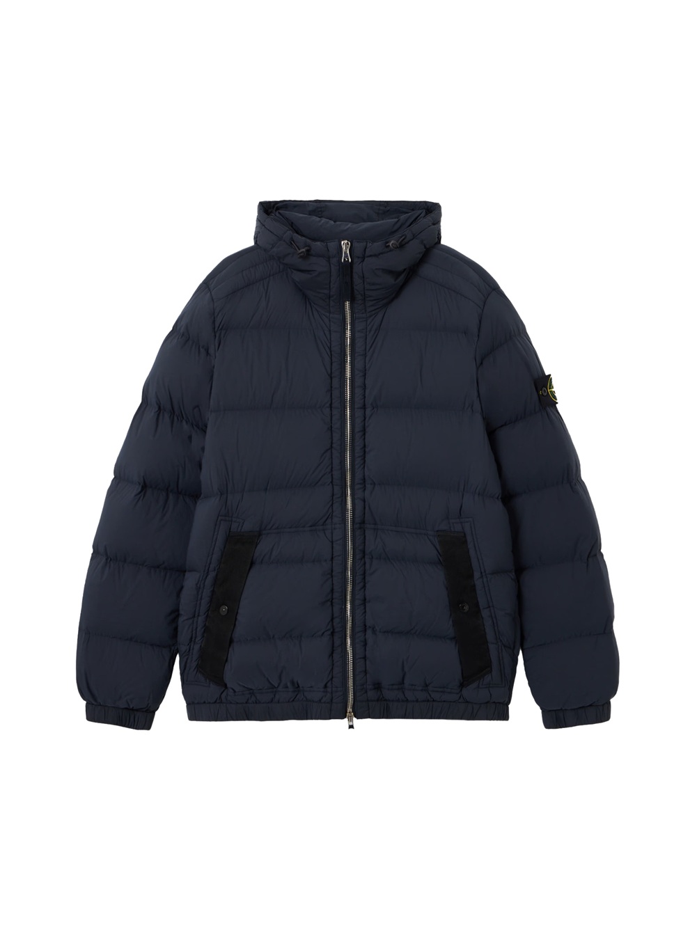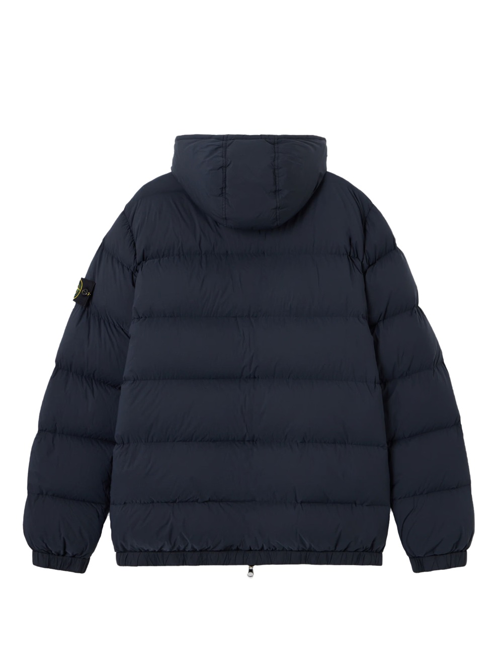 Hooded down jacket in lightweight stretch nylon with seamless channels for better down retention, padded hood, elasticated cuffs, two-way zip. Garment-dyed with water-repellent finish.